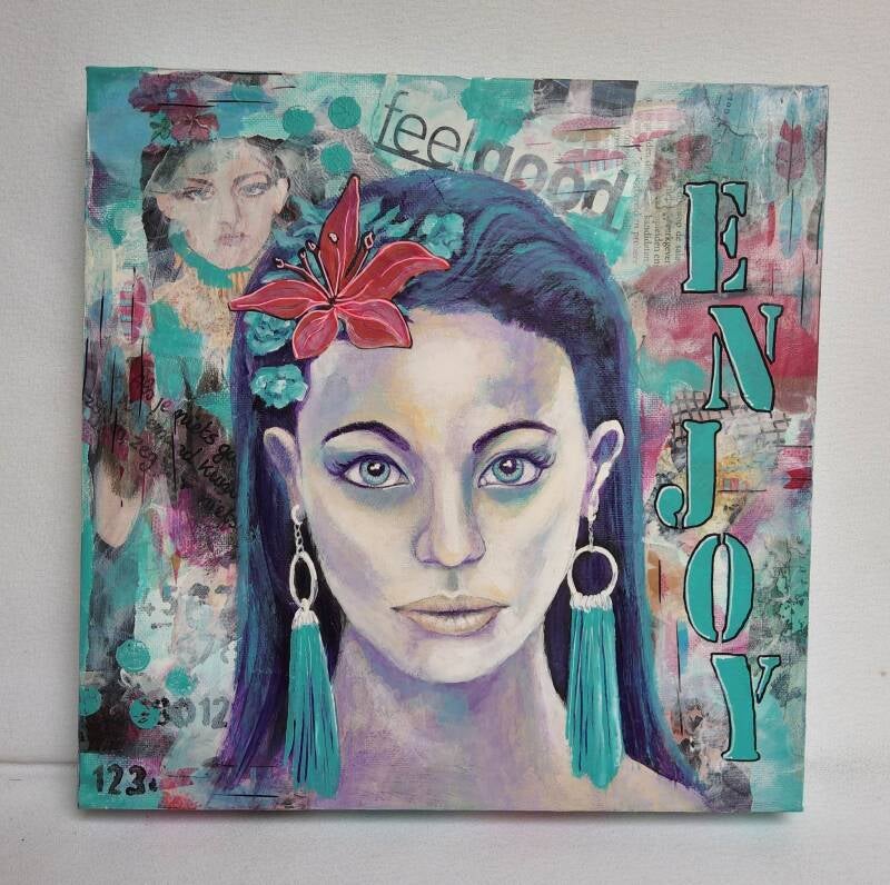 Op een ondergrond van collages en stencils handgeschilderd portret met acryl.