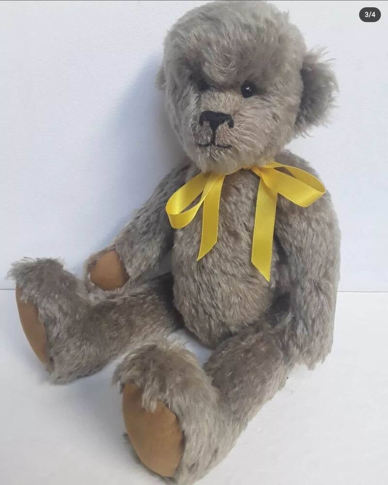 Marbobeer Mugsy van mohair. Totale lengte 33 cm en zittend 27 cm groot. Alle ledematen en hoofd zijn beweegbaar d.m.v. houten schijven. Handgemaakt van duits mohair stof, glazen ogen en een geborduurde neus. Mugsy is af te halen voor 50 euro, maar hij kan ook als pakketje per post voor de gebruikelijke portokosten.