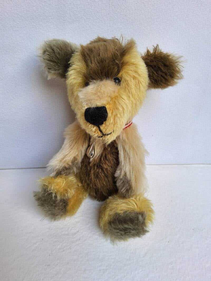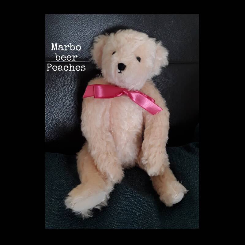 Mooi handgemaakt beertje (Peaches) van mohair stof. Haar achterbeentje is een klein beetje misvormd, maar dat maakt haar zelfs nog unieker en specialer. Zij heeft glazen ogen en een geborduurde neus en zittend is zij 26 cm hoog en de totale hoogte is 40 cm. Alle ledematen en haar hoofd kan bewegen d.m.v. houten schijven. Mocht U Peaches willen adopteren, dan kan dat voor 35 euro....